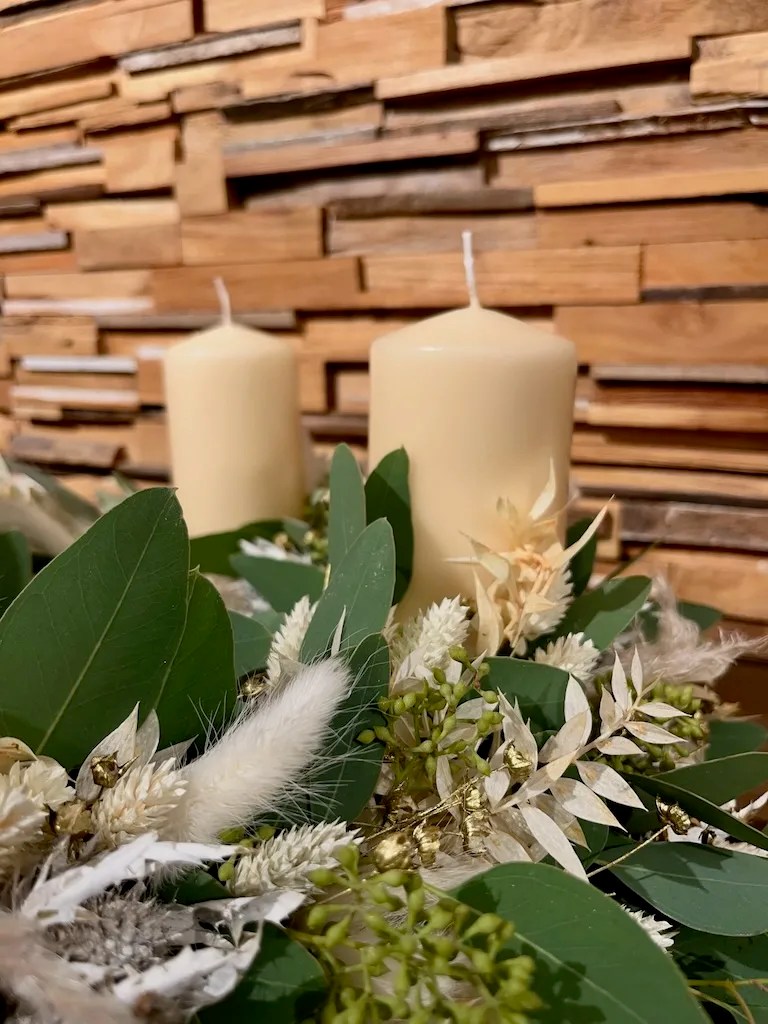 Mit unserem “Adventzauber ” schaffen Sie eine moderne, natürliche Atmosphäre für die Adventszeit. Dieser stilvolle Kranz, mit einem Durchmesser von ca. 37 cm, kombiniert aromatischen Eukalyptus mit feinen Trockenblumen in sanften Wintertönen und wird von vier cremefarbenen Kerzen perfekt ergänzt. Jede Kerze steht für einen Adventssonntag und lädt zum Innehalten und Genießen ein. Der Kranz ist in liebevoller Handarbeit gefertigt und verleiht Ihrem Zuhause ein dezentes, zeitloses Festtagsflair – ob als Tischkranz oder dekorativer Hingucker an Ihrer Wand.