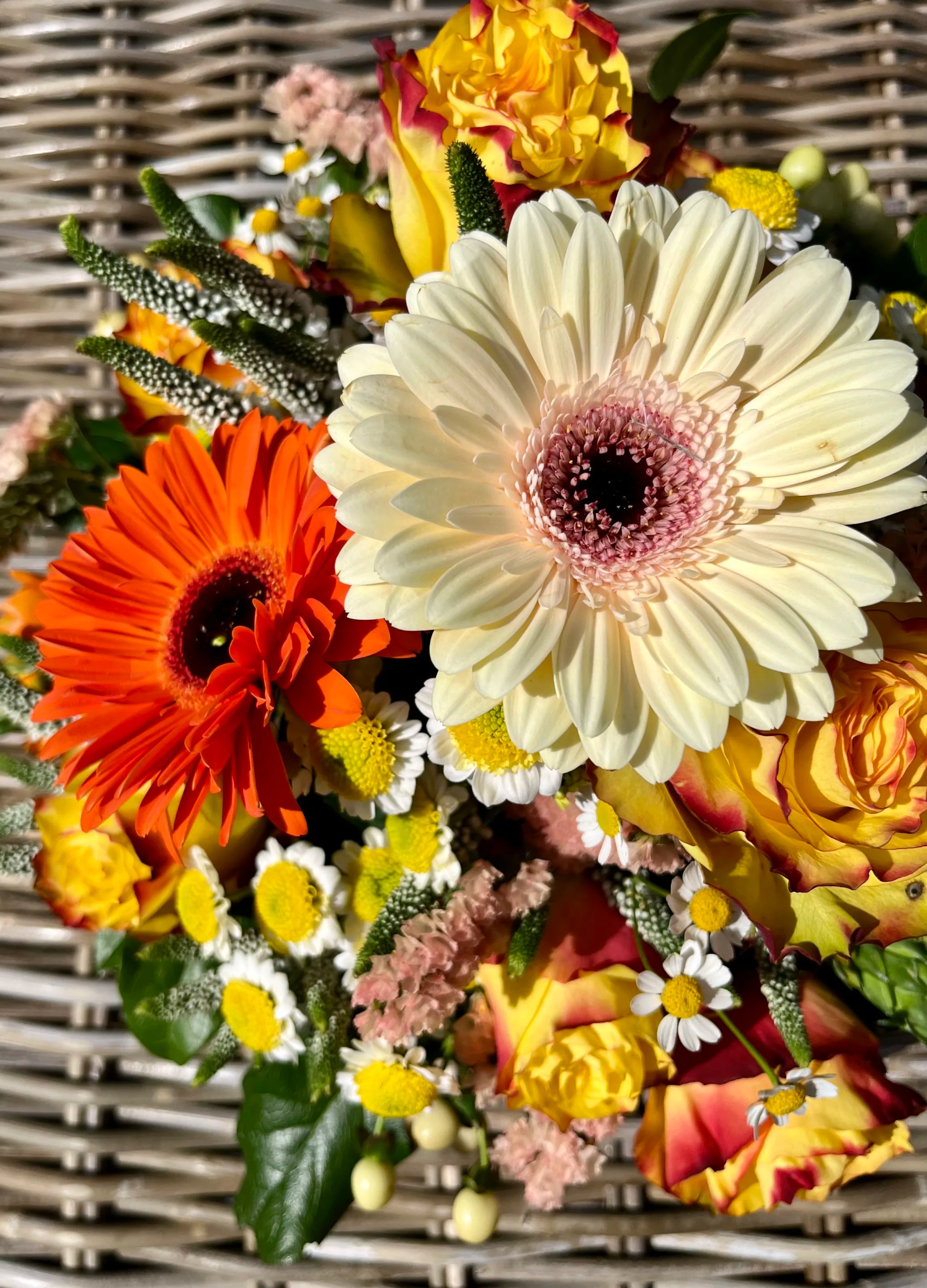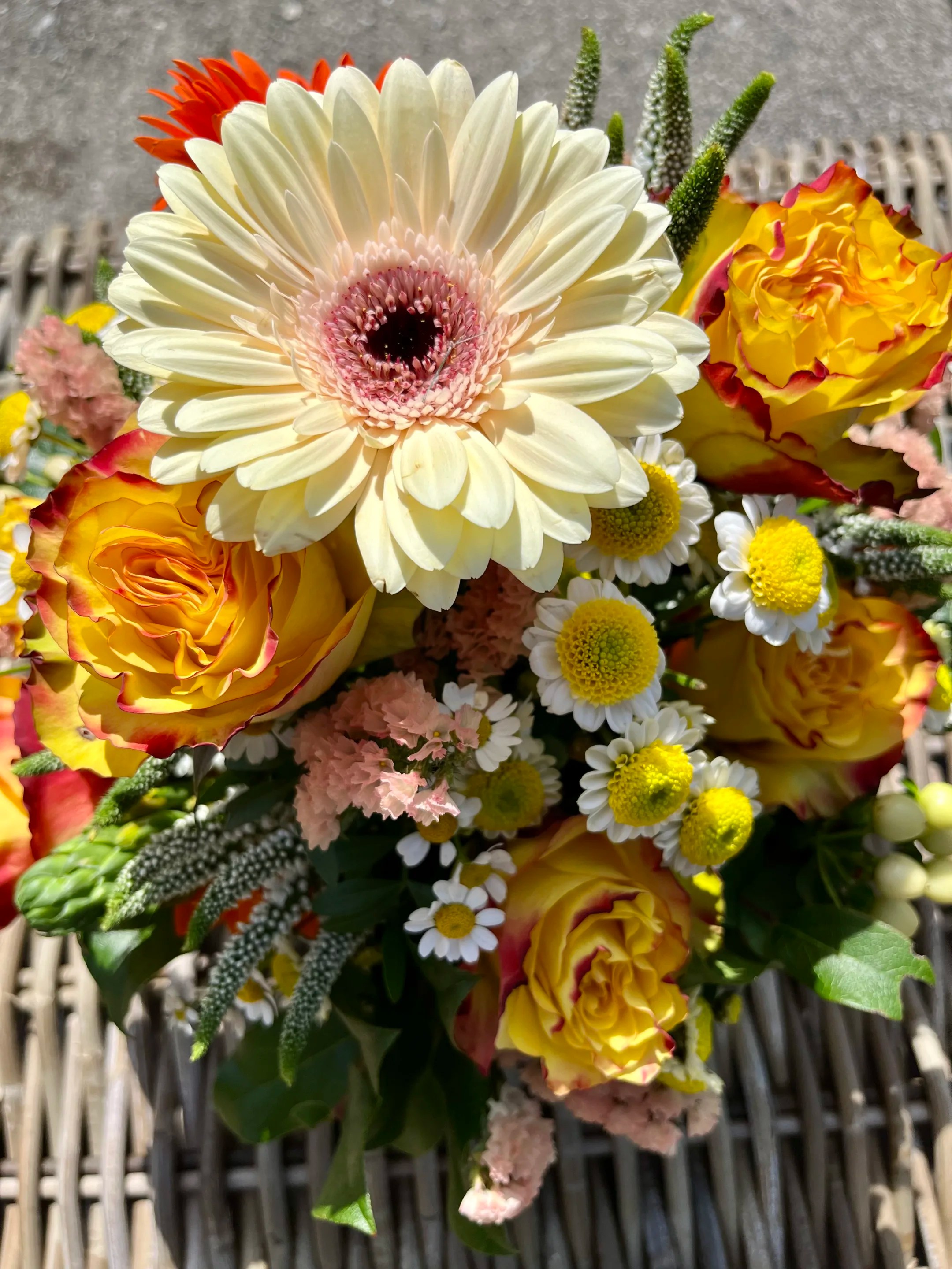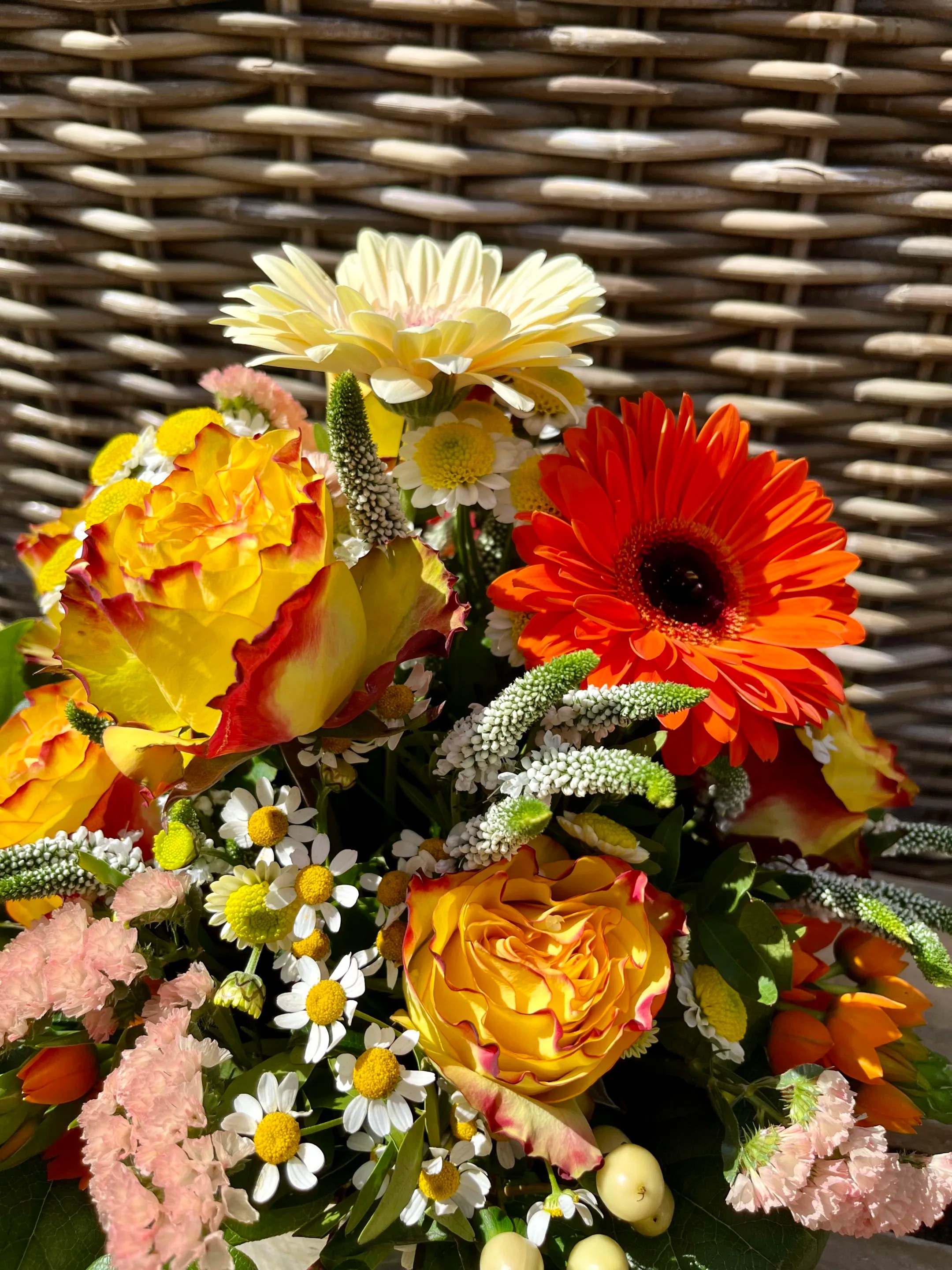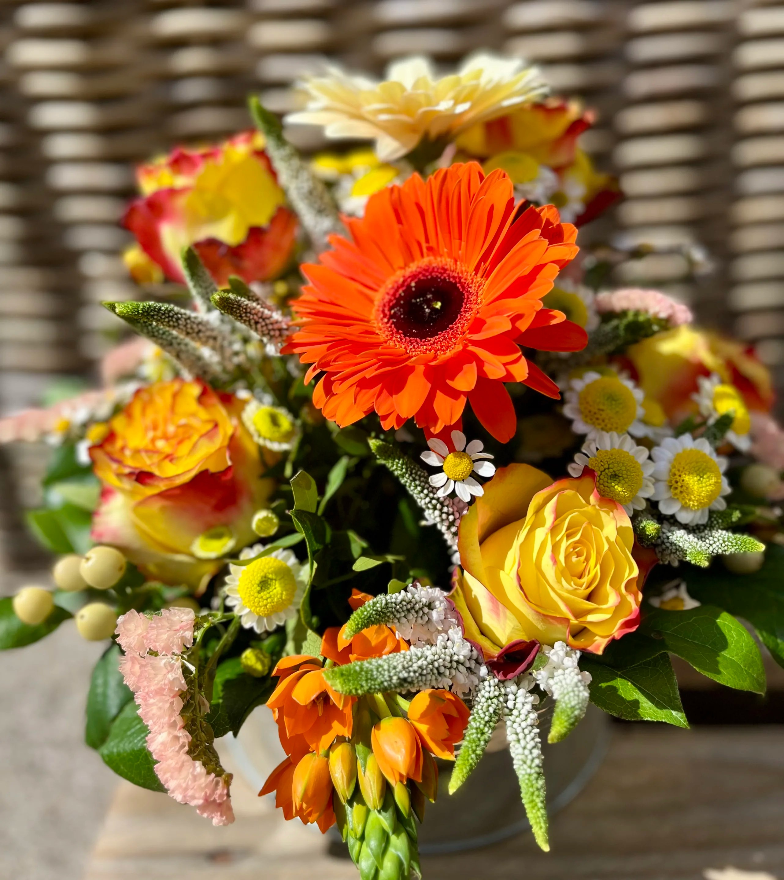 Dieses Schnittbumenarrangement wird von uns mit Liebe angefertigt. Dieses Blumenarrangement ist ein einzigartiges Meisterwerk aus frischen, handverlesenen Blumen. Sorgfältig arrangiert in einem stilvollem Gefäß, verleiht sie jedem Anlass Eleganz und Schönheit. Perfekt als Geschenk oder um Ihr Zuhause mit natürlicher Pracht zu schmücken. Die Schnittblumen werden von uns  in Frischblumensteckschaum gesteckt damit sie lang Freude daran haben.Blütenmischung kann vom Produktfoto abweich