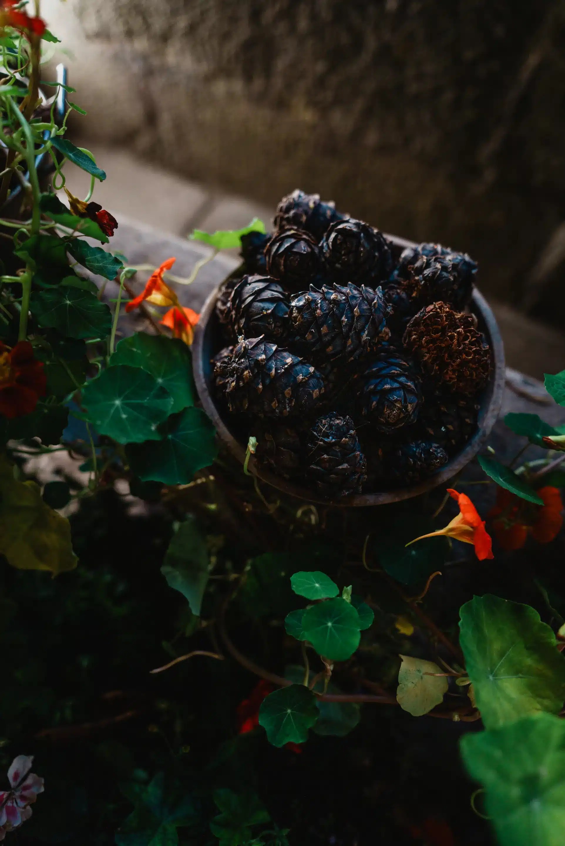 Der Trauerkranz, der in diesem Kunstwerk dargestellt wird, ist vollrund gestaltet, was in der Trauerarbeit häufig als Symbol für die Kontinuität des Lebens und die ewige Erinnerung verwendet wird. Das Hinzufügen eines Akzents in Form von „Einzirbenart“ verweist auf die Natur und die Berge, da die Zirbe oft in alpinen Regionen vorkommt. Dies betont die Verbindung zur Natur und zur Umgebung des Verstorbenen.
